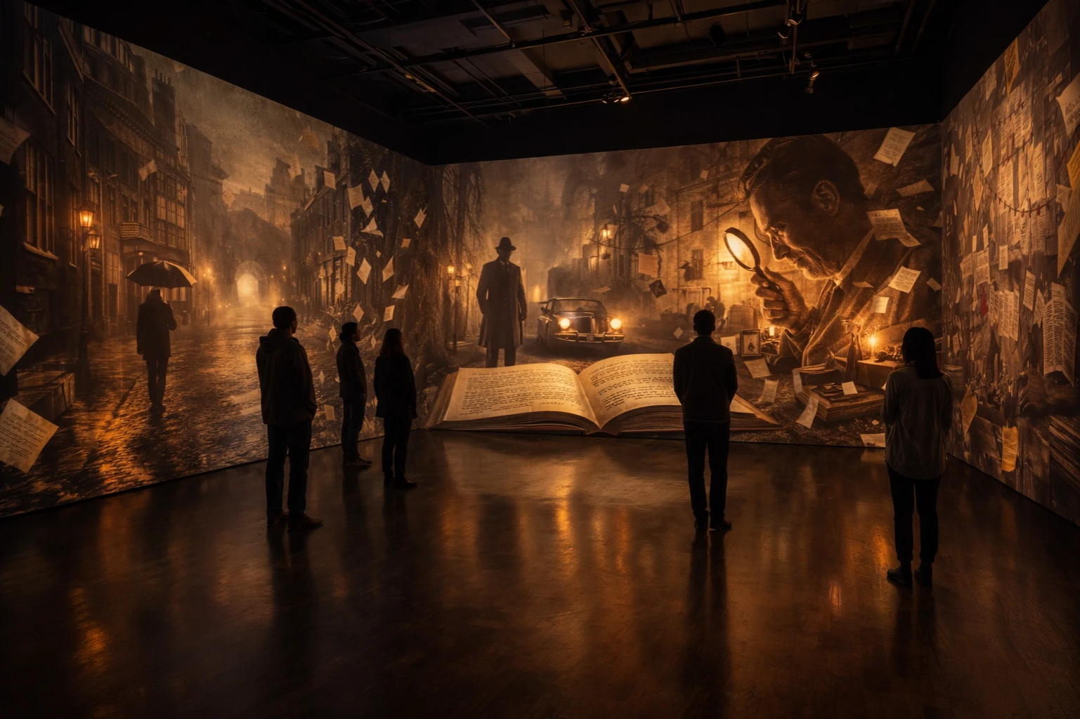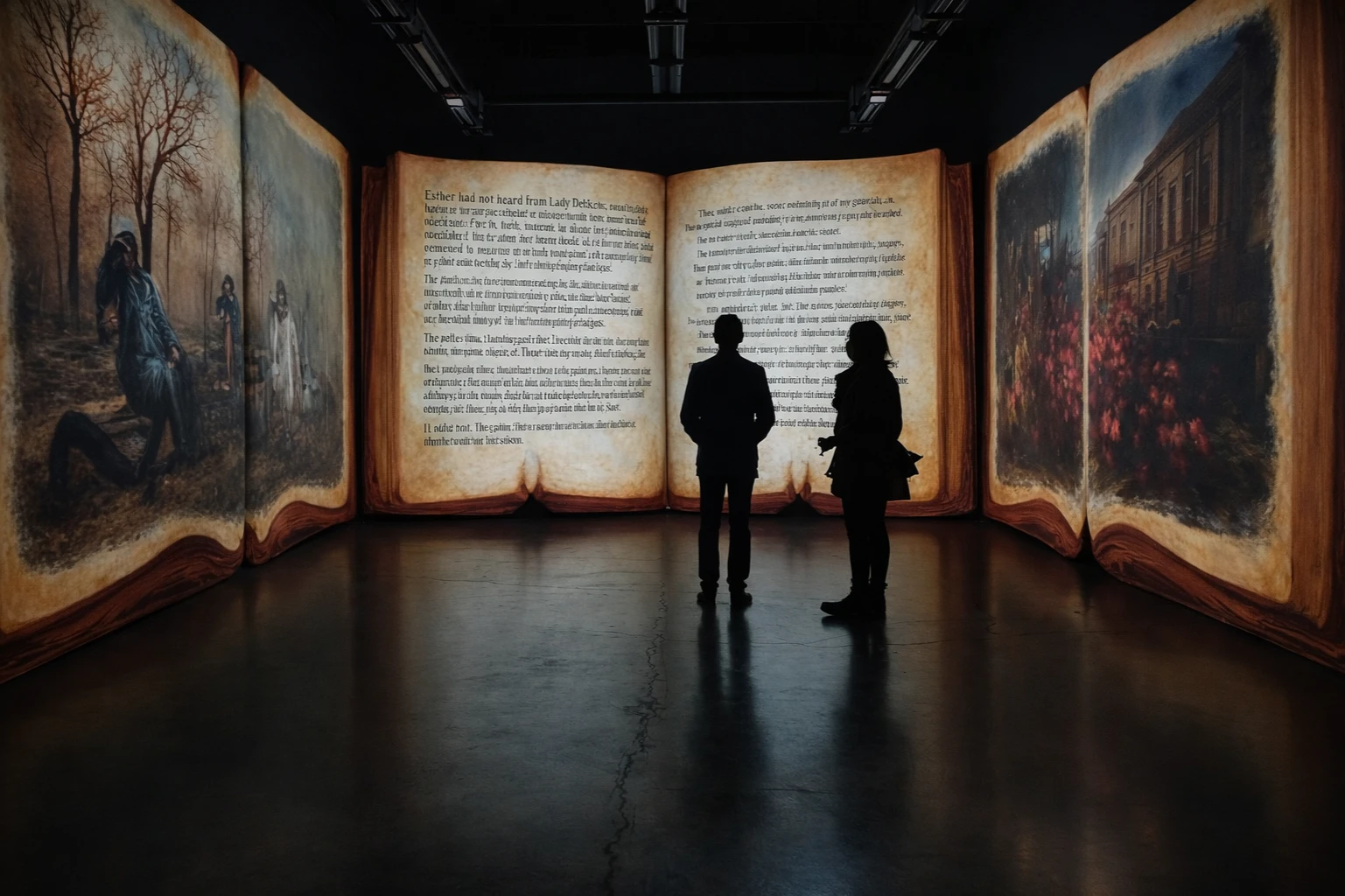 Paperclip develops curated literary installations that transform written works into immersive gallery experiences. Through projection, physical objects, text fragments, atmospheric lighting, and spatial storytelling, selected books are interpreted as environments visitors can step into.